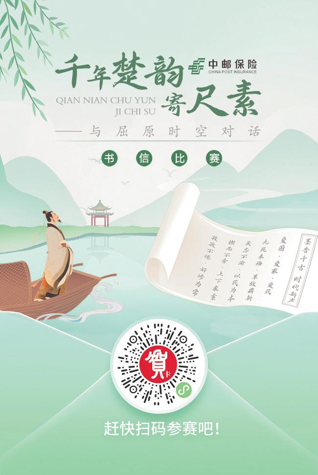 一紙方寸,千年楚魂。在《楚辭》特種郵票確定于5月31日首發(fā)后,湖北省郵政分公司提出以書信比賽為郵票發(fā)行引流造勢(shì)、同步推動(dòng)函件業(yè)務(wù)發(fā)展的設(shè)想。5月11日,由中郵保險(xiǎn)冠名的“千年楚韻寄尺素——與屈原時(shí)空對(duì)話”書信比賽橫空出世。此次比賽最大的亮點(diǎn)是參賽作品通過“寄賀卡”小程序線上征集,這也是中國(guó)郵政首次利用線上小程序開展的書信比賽活動(dòng)。