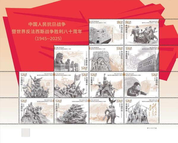 根據(jù)黨中央有關(guān)中國人民抗日戰(zhàn)爭暨世界反法西斯戰(zhàn)爭勝利80周年紀(jì)念活動安排,中國郵政于9月3日發(fā)行《中國人民抗日戰(zhàn)爭暨世界反法西斯戰(zhàn)爭勝利八十周年》紀(jì)念郵票1套13枚、小型張1枚,全套面值為20.8元。