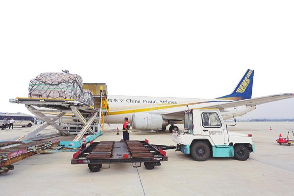 郵航飛機(jī)滿載中郵集運(yùn)貨物駛向海外。
