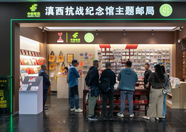 滇西抗戰(zhàn)紀(jì)念館主題郵局內(nèi)陳列著以中國遠(yuǎn)征軍、滇西抗戰(zhàn)為主題的郵品與文創(chuàng)產(chǎn)品?!斑@不僅是一張明信片,更是一段歷史的傳遞?!眮碜跃挼榈膶W(xué)生張?jiān)莆母袊@道。這家郵局以它獨(dú)特的方式,將悲壯的家國記憶凝聚于郵票與一枚枚郵戳之中,讓歷史變得可觸摸、可感知、可流傳。