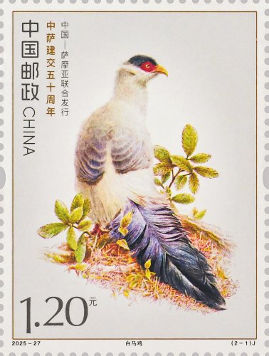 本套郵票以兩國的特色鳥類為核心設計元素,融西方鋼筆線條與東方淡彩的表現技法,筆觸細膩傳神,形象生動逼真,兩只禽鳥顧盼相應、神氣貫連,洋溢著蓬勃的生命力。本套郵票既展現兩國獨特的自然生態之美,更傳遞出兩國友誼的深厚底蘊與美好未來。第一枚郵票表現了白馬雞。作為四川丹巴莫斯卡鳥類重要棲息地的主要保護物種,白馬雞也成為丹巴自然生態的鮮活代表,當地獨特的高原氣候、適宜的生態環境為其提供了理想生存空間。第二枚郵票表現了齒嘴鳩。作為薩摩亞的本土特有鳥類,齒嘴鳩不僅是當地生態系統的重要成員,更被視為薩摩亞自然與文化遺產的象征,承載著薩摩亞人民對家鄉土地的熱愛與珍視。