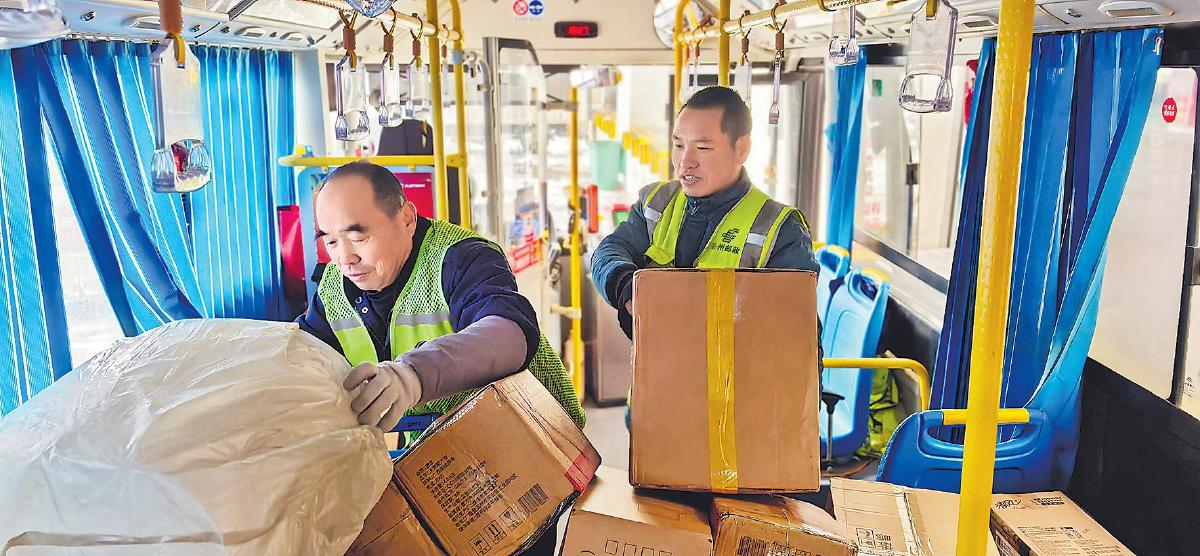 古井鎮(zhèn)郵政鎮(zhèn)級運(yùn)營中心投遞員葉魏從公交車駕駛員手中接過待投包裹。