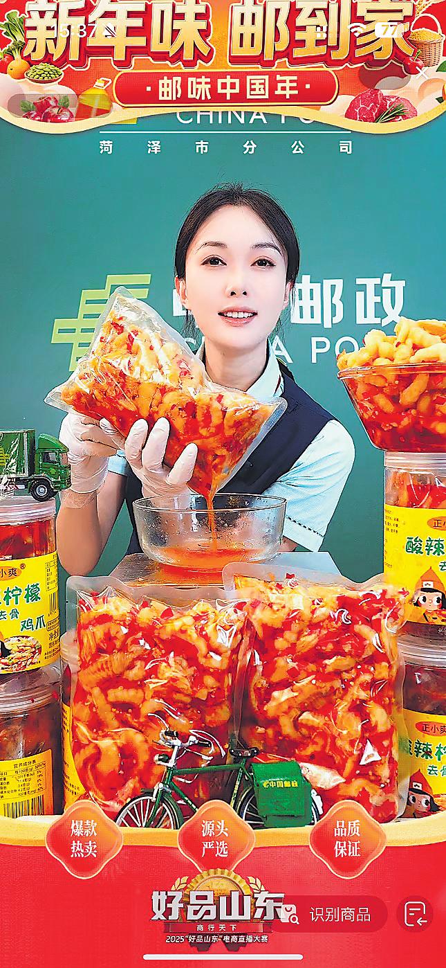 2025年11月,菏澤郵政啟動“年貨節(jié)”專項策劃,建立市、縣郵政聯(lián)動的選品機制,緊跟節(jié)日消費趨勢與網(wǎng)民偏好,在暢銷的酸辣無骨雞爪的基礎(chǔ)上,新增佤味雞爪等品類,持續(xù)優(yōu)化產(chǎn)品組合,精準(zhǔn)對接市場需求。