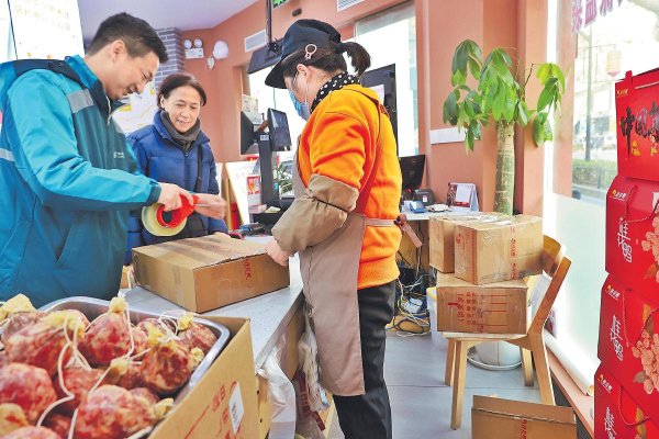 春節前夕,“土味年貨”的銷售與寄遞進入高量期。江蘇郵政積極做好收寄服務,全力保障郵件時限,自1月以來,生鮮品類郵件業務量同比增長61.9%。圖為南京市郵政分公司中華門支局員工來到一家桂花鴨專賣店,為客戶提供年貨隨買隨寄服務。