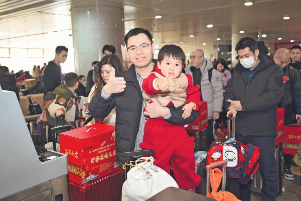 2月10日,廣西壯族自治區郵政分公司在北京西站參與舉辦廣西在京津冀務工創業人員“溫暖回家”活動,并送上新春禮包,贏得老鄉父子點贊?! 踮w明震 攝
