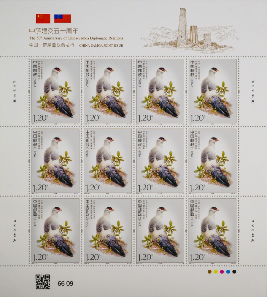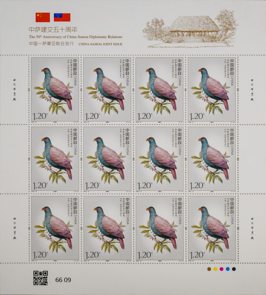 本套郵票以兩國的特色鳥類為核心設(shè)計(jì)元素,融西方鋼筆線條與東方淡彩的表現(xiàn)技法,筆觸細(xì)膩傳神,形象生動逼真,兩只禽鳥顧盼相應(yīng)、神氣貫連,洋溢著蓬勃的生命力。本套郵票既展現(xiàn)兩國獨(dú)特的自然生態(tài)之美,更傳遞出兩國友誼的深厚底蘊(yùn)與美好未來。第一枚郵票表現(xiàn)了“白馬雞”。作為四川丹巴莫斯卡鳥類重要棲息地的主要保護(hù)物種,白馬雞也成為丹巴自然生態(tài)的鮮活代表,當(dāng)?shù)鬲?dú)特的高原氣候、適宜的生態(tài)環(huán)境為其提供了理想生存空間。第二枚郵票表現(xiàn)了“齒嘴鳩”。作為薩摩亞的本土特有鳥類,齒嘴鳩不僅是當(dāng)?shù)厣鷳B(tài)系統(tǒng)的重要成員,更被視為薩摩亞自然與文化遺產(chǎn)的象征,承載著薩摩亞人民對家鄉(xiāng)土地的熱愛與珍視。
