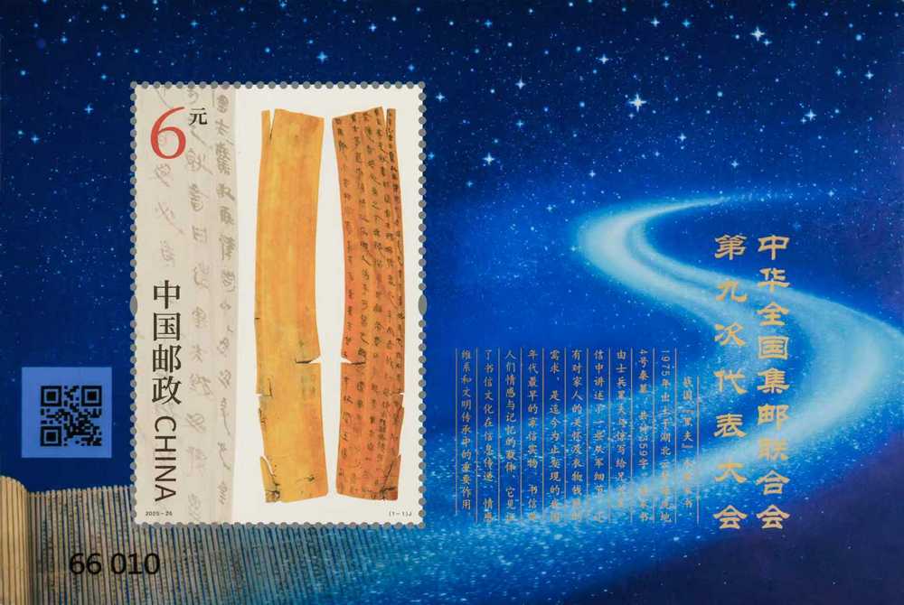 小型張圖案表現了“黑夫木牘”。該木牘在1975年出土于湖北省云夢縣睡虎地4號秦墓,是目前考古發現的最早家書,延續了中華全國集郵聯合會大會系列郵票以郵驛文化元素為表現內容的慣例。該家書由士兵黑夫與驚寫給兄長衷,信中講述了一些從軍細節,還有對家人的關懷及衣物錢糧的需求。邊飾背景中展開的竹簡似一條時光長河,在象征中華文明的浩瀚星空里蜿蜒伸展,穿越千年、對話古今,蘊含了中華文明在傳承中創新,在創新中發展的思想智慧。