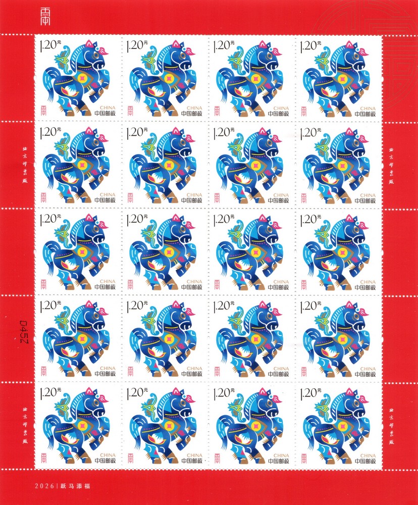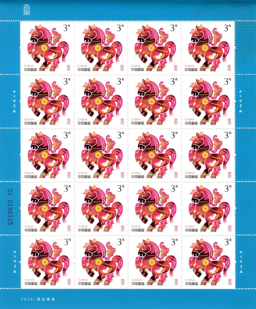 注:采用“躍馬添福”和“鴻運(yùn)馳春”郵票印制小全張1枚,規(guī)格為120×190毫米。小全張專用于2026年中國郵政賀年有獎(jiǎng)產(chǎn)品(祝福卡型15元)。